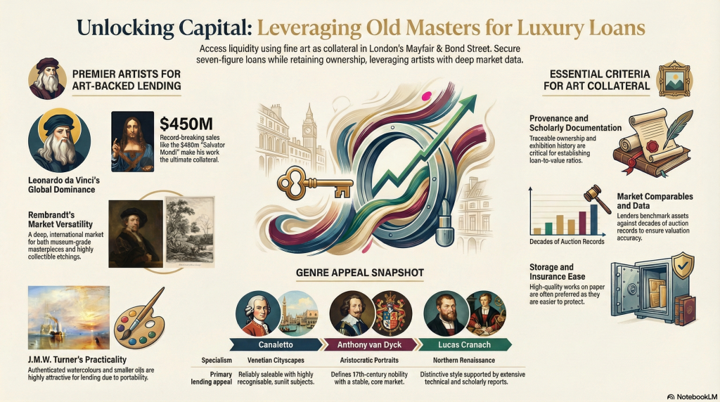 That tight supply, combined with record‑breaking prices such as the sale of “Salvator Mundi” for around $450 million, makes him one of the strongest possible anchors for collateral lending on Old Master art.
